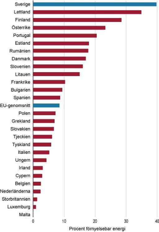 Idag är skillnaderna stora mellan EUEU:-länderna när det gäller hur mycket förnyelsebar energiförnyelsebar energi: man konsumerar. Sverige ligger i topp med en andel på 40 procent. I botten hittar man länder som Storbritannien och Luxemburg, med andelar runt 1 procent. Genomsnittet för hela EUEU: ligger på 8,5 procent.