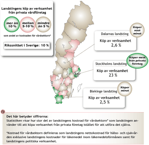 De övriga landstingen köpte verksamhet för mindre än en tiondel under förra året. Allra minst verksamhet köpte landstingen i Dalarna och Blekinge. Dessa landsting använde knappt tre procent av vårdsektorns kostnader till att köpa verksamhet från näringslivetnäringslivet: under år 2009. Faktum är att hälften av Sveriges landsting använde mindre än fem procent av deras totala kostnader för vårdsektorn till att köpa in verksamhet från privata företagföretag: förra året.