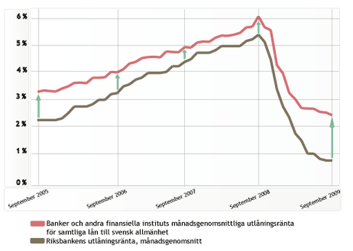 Under hela högkonjunkturen ökade reporäntanreporäntan: från 1,50 procent i september 2005 till 4,75 procent i september 2008. Under denna period minskade också skillnaden mellan Riksbankens utlåningsränta och bankernas genomsnittliga utlåningsräntor från 1,05 procent till 0,68 procent. Denna utveckling är logisk eftersom en högre räntaränta: innebär en minskad vilja att låna från allmänheten, vilket innebär att bankerna håller nere sina utlåningsräntor en bit för att locka till sig fler kunder som vill låna från banken.